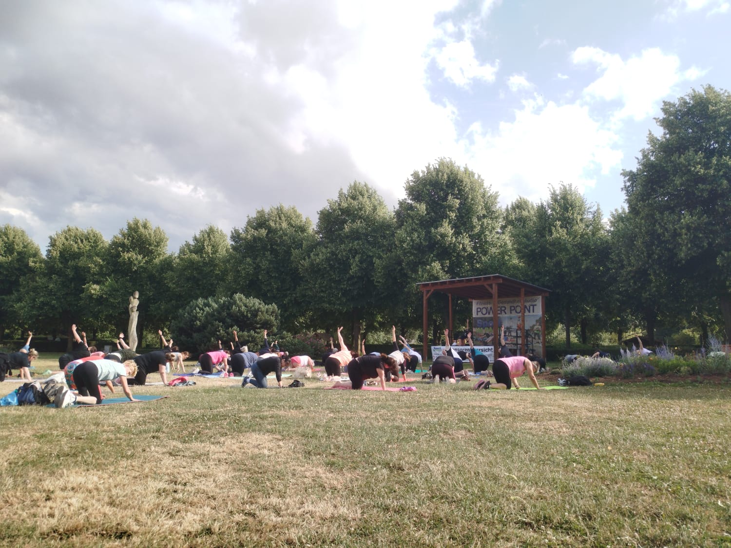 84 klasse Yoga-Teilnehmer bei einem Traumwetter im Brückenkopf-Park.